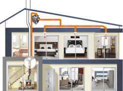 Schéma type d’une distribution d’air chaud Aeroval avec un poêle à bois avec un Opti’air couplé avec extracteur Zéphir.